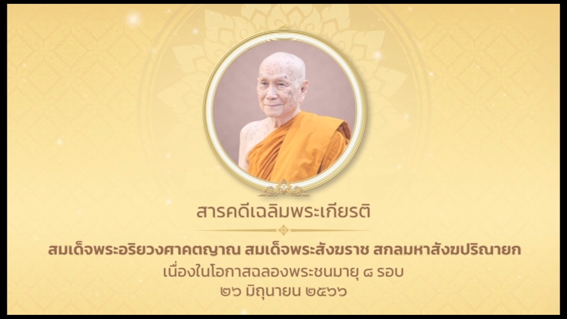คณะกรรมการเอกลักษณ์ของชาติ สำนักงานปลัดสำนักนายกรัฐมนตรี ขอเชิญชมสารคดีโทรทัศน์เฉลิมพระเกียรติสมเด็จพระอริยวงศาคตญาณ สมเด็จพระสังฆราช สกลมหาสังฆปริณายก เนื่องในโอกาสฉลองพระชนมายุ ๘ รอบ ๒๖ มิถุนายน ๒๕๖๖