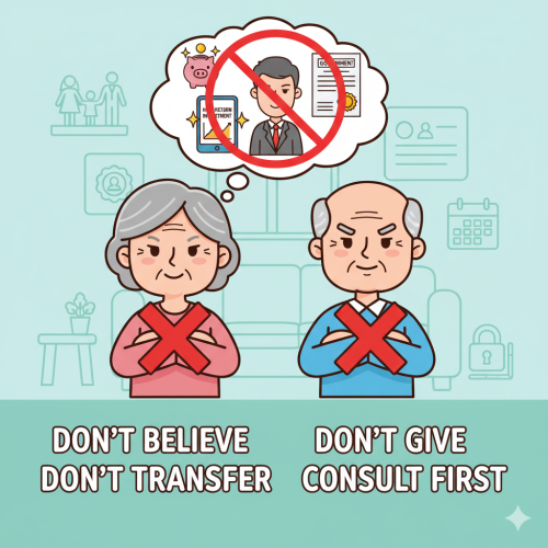 2. ไม่รีบ: ไม่ว่ามิจฉาชีพจะเร่งให้ท่านทำอะไรก็ตาม ให้ตอบไปว่า "จะปรึกษาลูกหลานก่อน" แล้ววางสายทันที ความเร่งรีบคือจุดอ่อนที่จะทำให้ท่านตกเป็นเหยื่อ