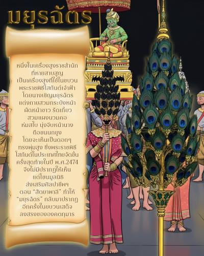 "มยุรฉัตร" เป็นเครื่องสูงที่ใช้ในขบวนพระราชพิธีโสกันต์ (การโกนจุก) ของเจ้าฟ้า มีลักษณะเป็นขนนกยูงทรงพุ่มสูง ถือโดยนางเชิญมยุรฉัตร ซึ่งแต่งกายตามแบบแผนโบราณอย่างงดงาม ทั้งการสวมกระบังหน้า ผัดหน้าขาว รัดเกี้ยว สวมแผงนวมคอ ห่มสไบ และนุ่งจีบหน้านาง